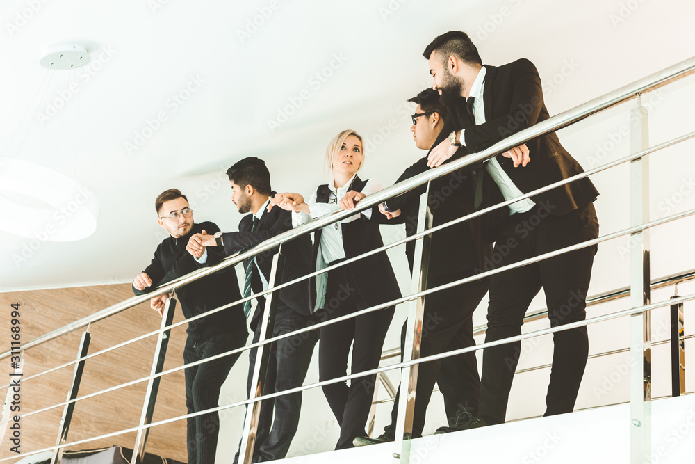 A team of young businessmen working and communicating together in an office. Corporate businessteam and manager in a meeting.
