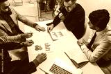 A team of young businessmen working and communicating together in an office. Corporate businessteam and manager in a meeting.