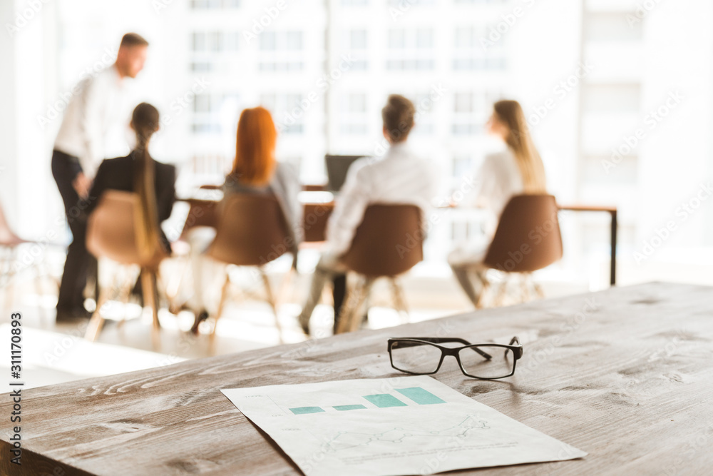 blurred photo in defocus. A team of young businessmen working and communicating together in an office. Corporate businessteam and manager in a meeting.