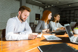 A team of young businessmen working and communicating together in an office. Corporate businessteam and manager in a meeting.