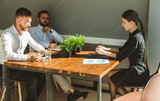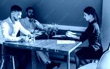 A team of young businessmen working and communicating together in an office. Corporate businessteam and manager in a meeting.
