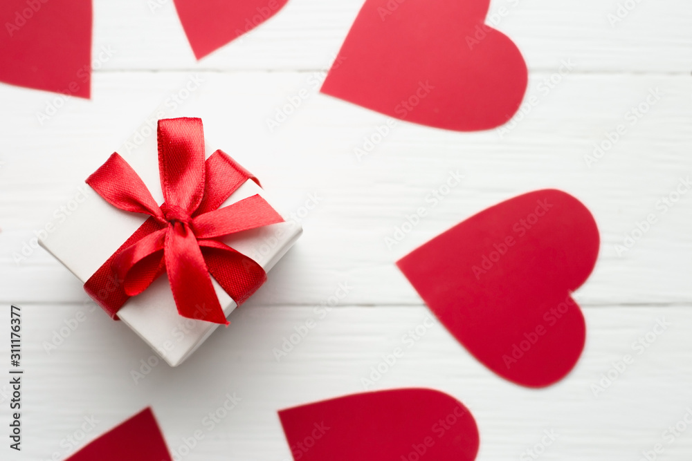 Red hearts with a gift box on a white wooden background. Happy Valentine's day red hearts on wooden background