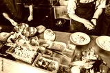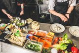 Professional chef cooking in the kitchen restaurant at the hotel, preparing dinner. A cook in an apron makes a salad of vegetables and pizza.