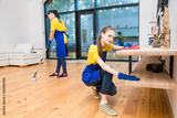 professional cleaning service. Two women in working uniform, in aprons, divide the cleaning of the kitchen of a private house, cottage. Washing floor