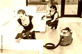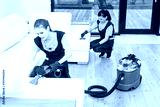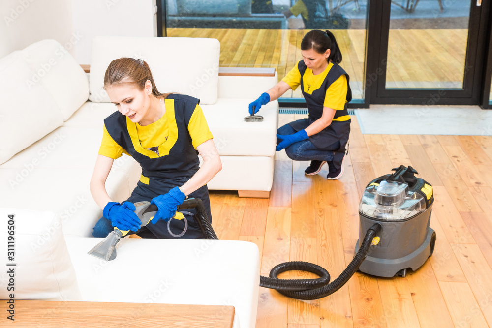 professional cleaning service. Two women in working uniform, in aprons. Two women in working uniform, in aprons, divide the cleaning of private house, cottage. Washing , vacuum cleaning the sofa