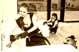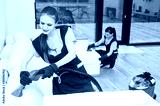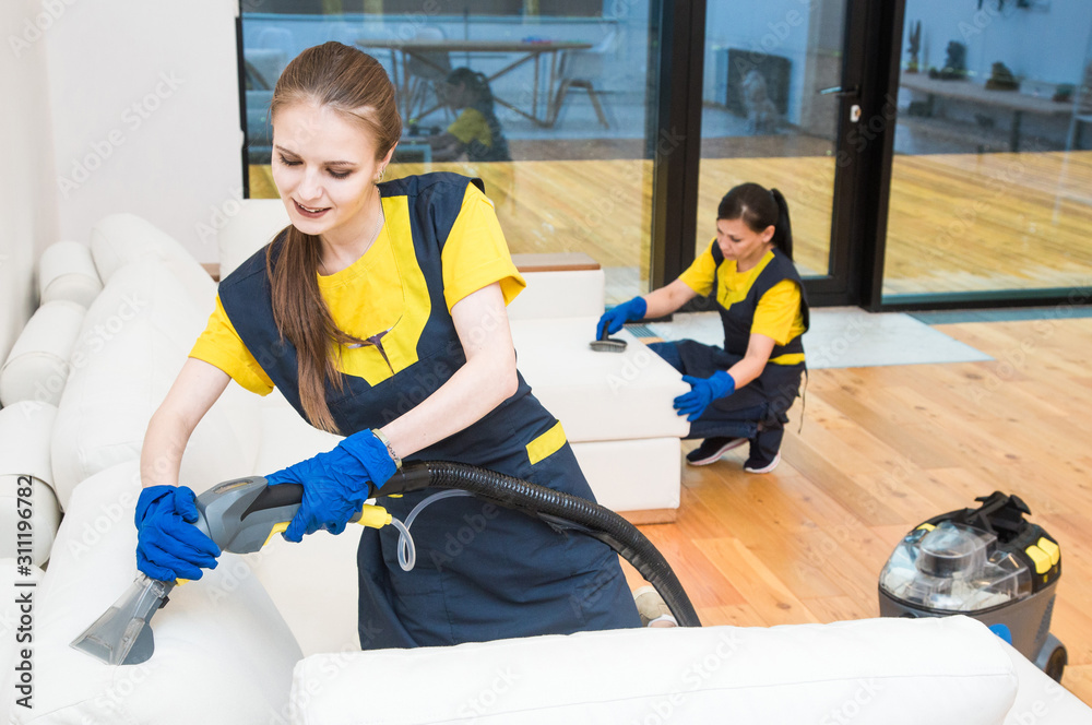 professional cleaning service. Two women in working uniform, in aprons. Two women in working uniform, in aprons, divide the cleaning of private house, cottage. Washing , vacuum cleaning the sofa