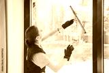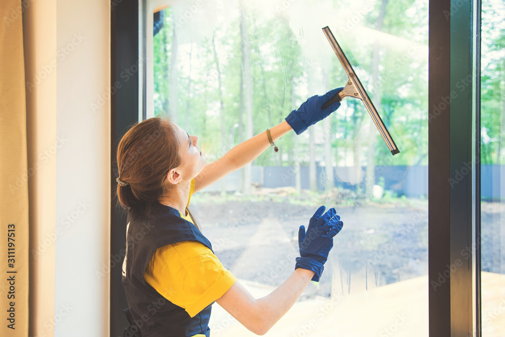 professional cleaning service. woman in uniform and gloves sponge washes panoramic windows in the cottage. washing steam mop and scraper