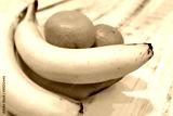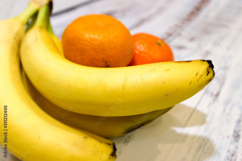 bananas and clementines on the wooden table closeup