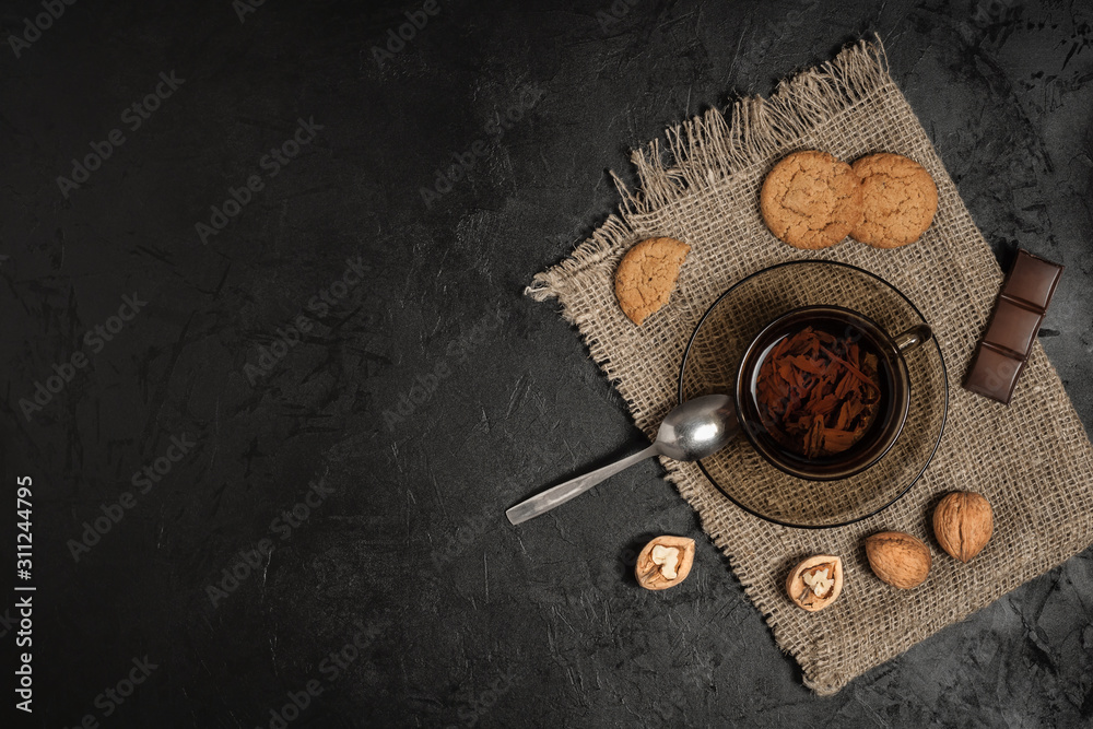 tea in a transparent cup with cookies, walnuts and chocolate on a burlap napkin and black concrete background. top view with copy space