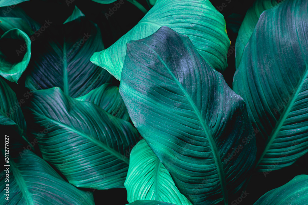 leaves of Spathiphyllum cannifolium, abstract green texture, nature background, tropical leaf