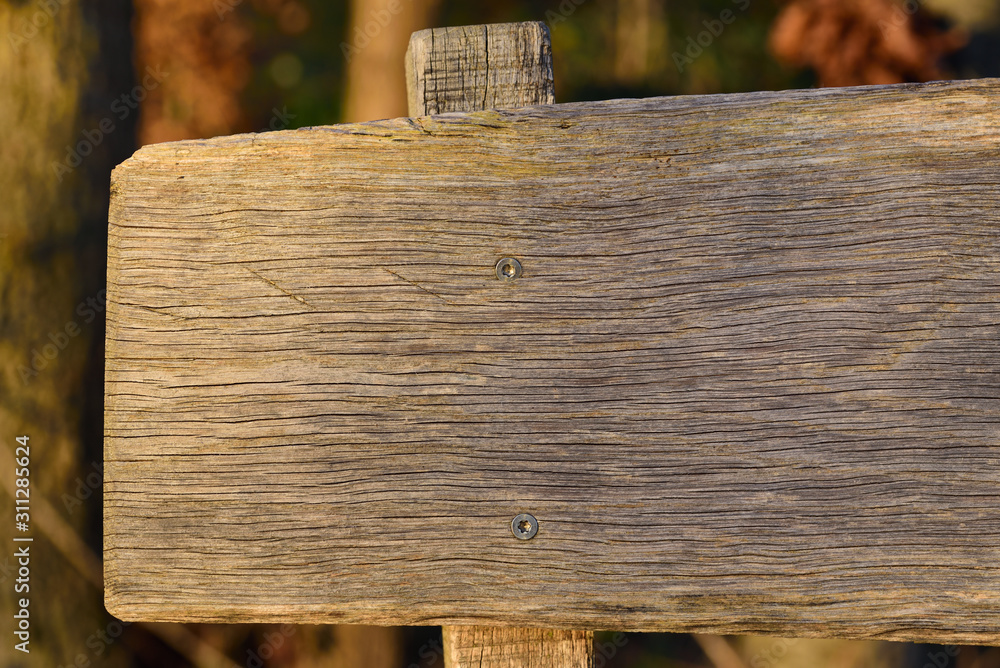 Text box and background from a rustic weathered wooden chalkboard in sunlight in the forest in front of trees