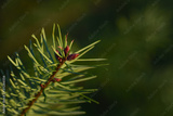 Close-up of a young branch of a spruce or fir tree with green needles and fresh buds against a green background