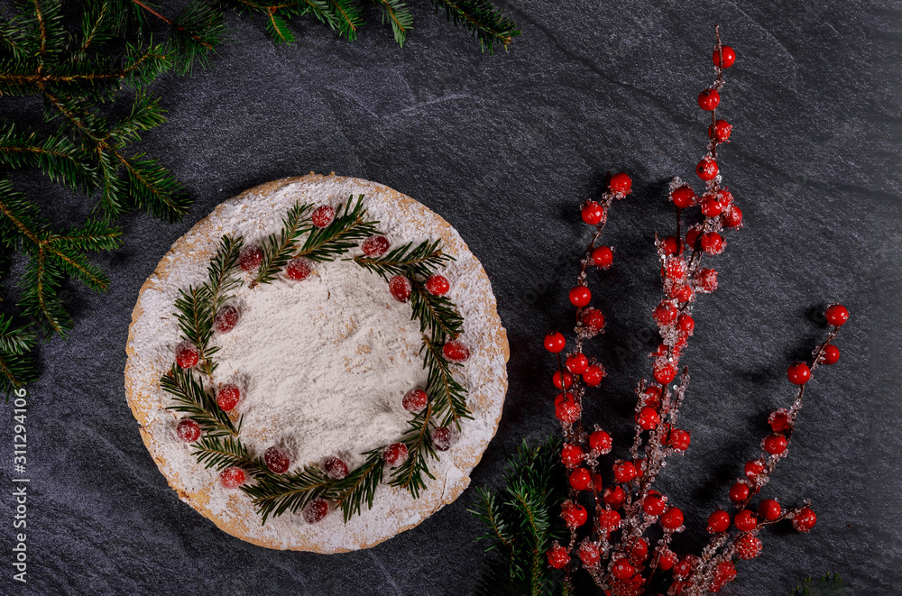 Christmas night with festive cake decorated with cranberry and pine branches.