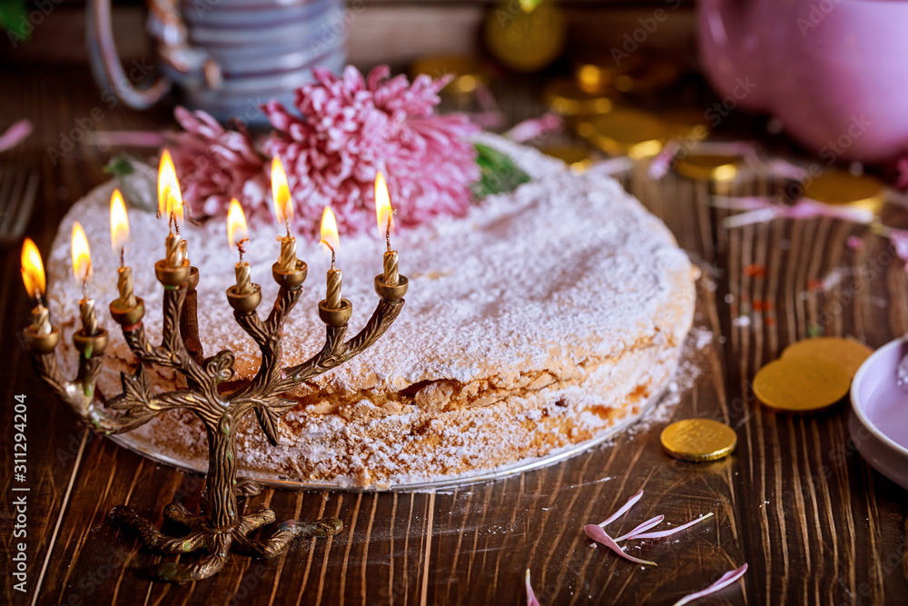 Jewish menorah with candles and holiday cake decorated with flowers.