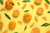 Flat lay composition with fresh ripe tangerines and leaves on light yellow background. Citrus fruit
