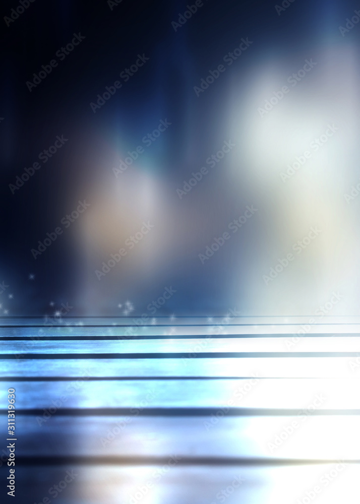 Dark winter background. Wood table top in the foreground, blurred festive background with bokeh in the foreground