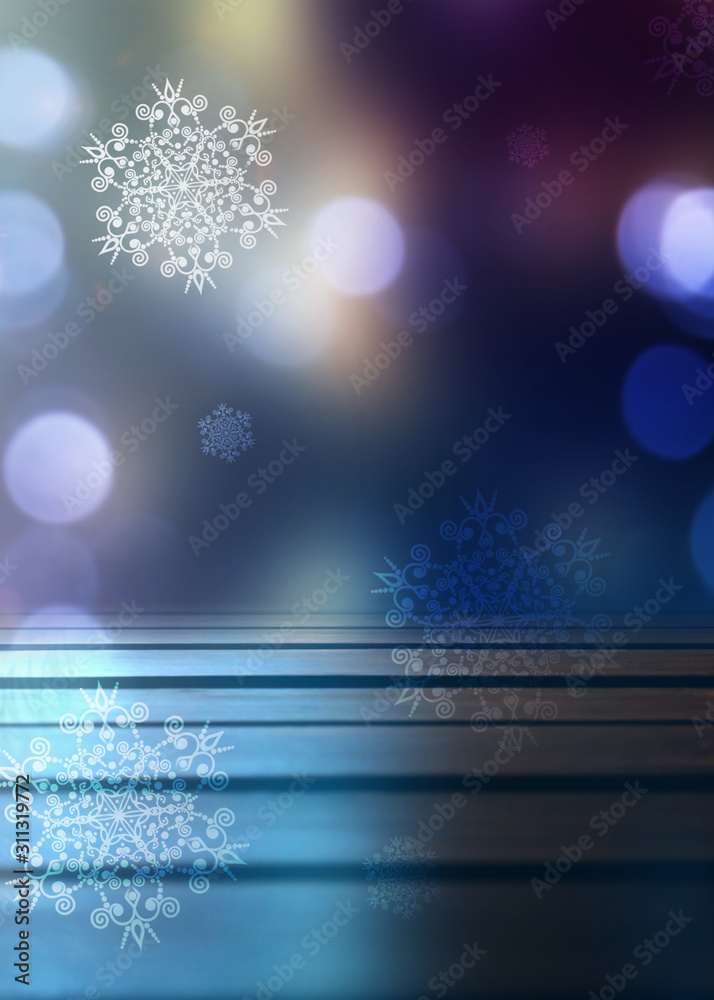 Dark winter background. Wood table top in the foreground, blurred festive background with bokeh in the foreground