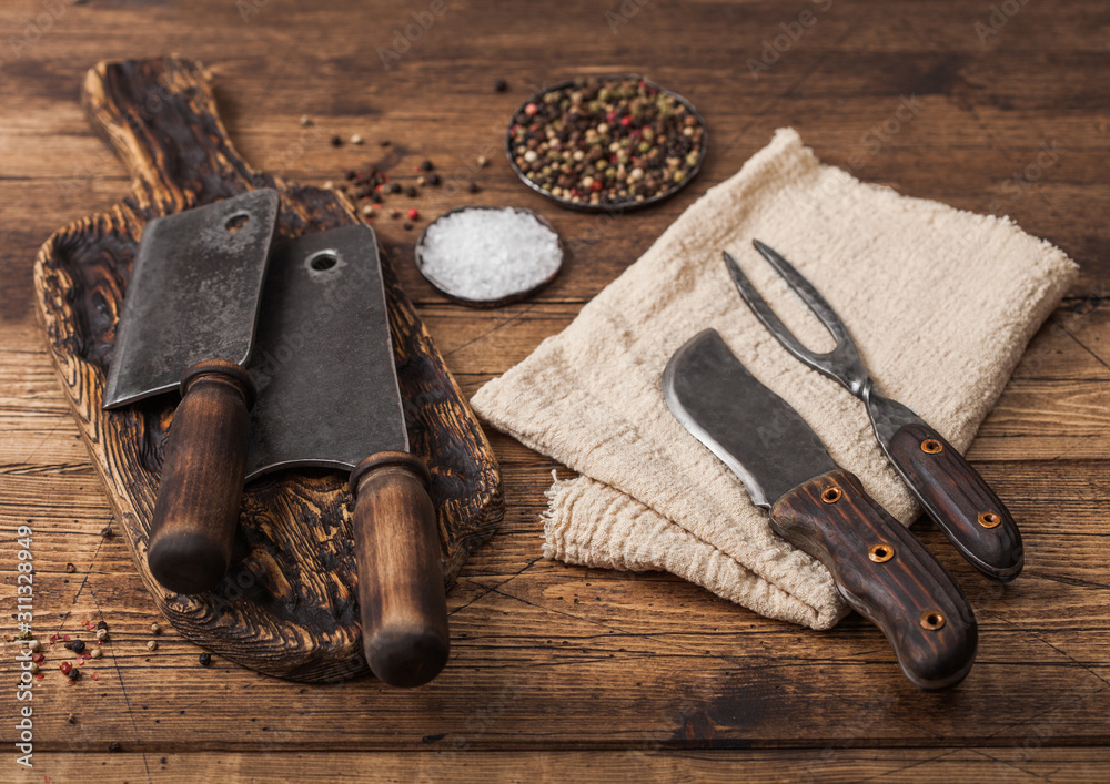 Vintage hatchets for meat on wooden chopping board with salt and pepper on wooden table background with linen towel and fork and knife.