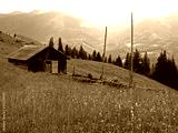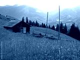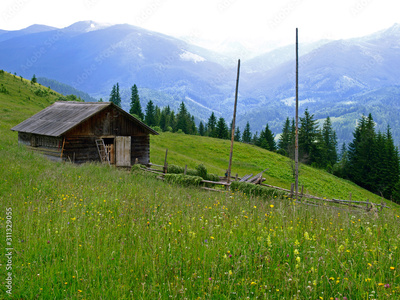 Household (Farmer barn) high on the meadow in green mountains. Picturesque summer mountain landscape with Spruce forest in the Eastern Carpathians. An old gutsul wooden architecture in highlands