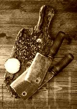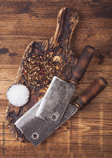 Vintage hatchets for meat on wooden chopping board with salt and pepper on wooden table background.