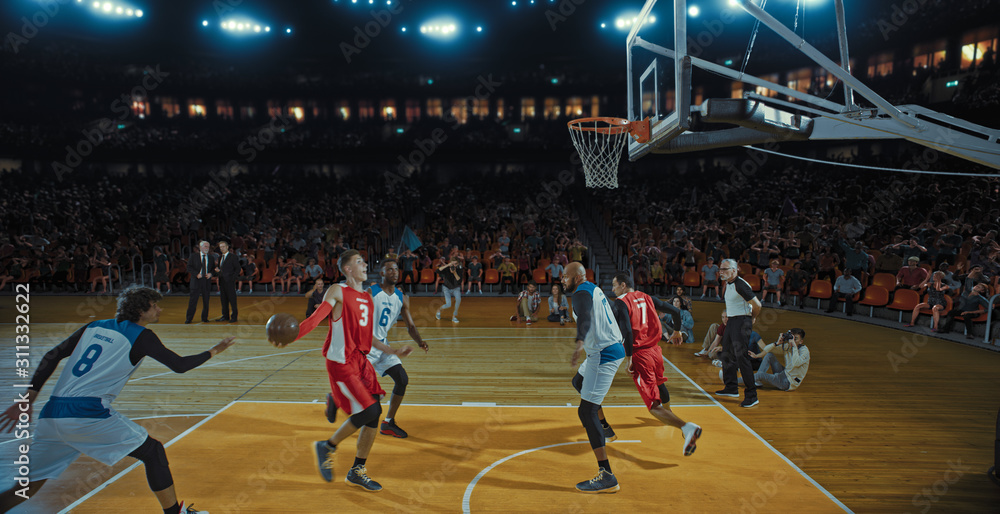 Basketball players on big professional arena during the game. Tense moment of the game. Celebration