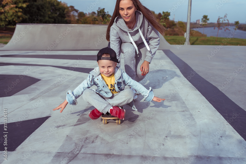 Young woman mom teaches skateboarding, little son boy, skateboard. Rest on weekend in street in park. Everyday warm clothes, autumn day