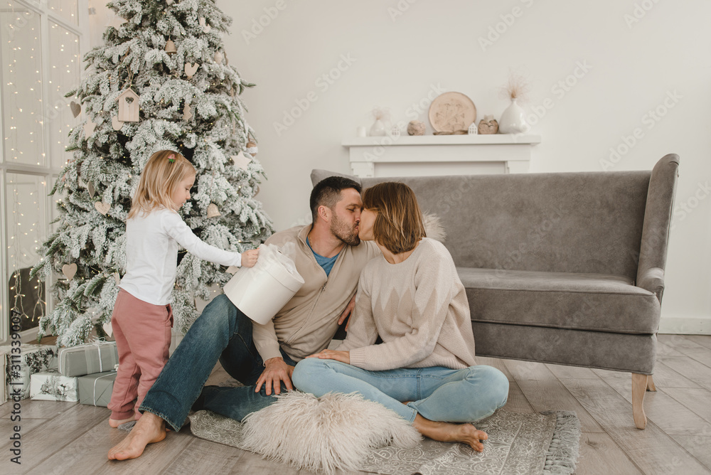 Family Christmas morning in a bright minimalistic living room near the Christmas tree.