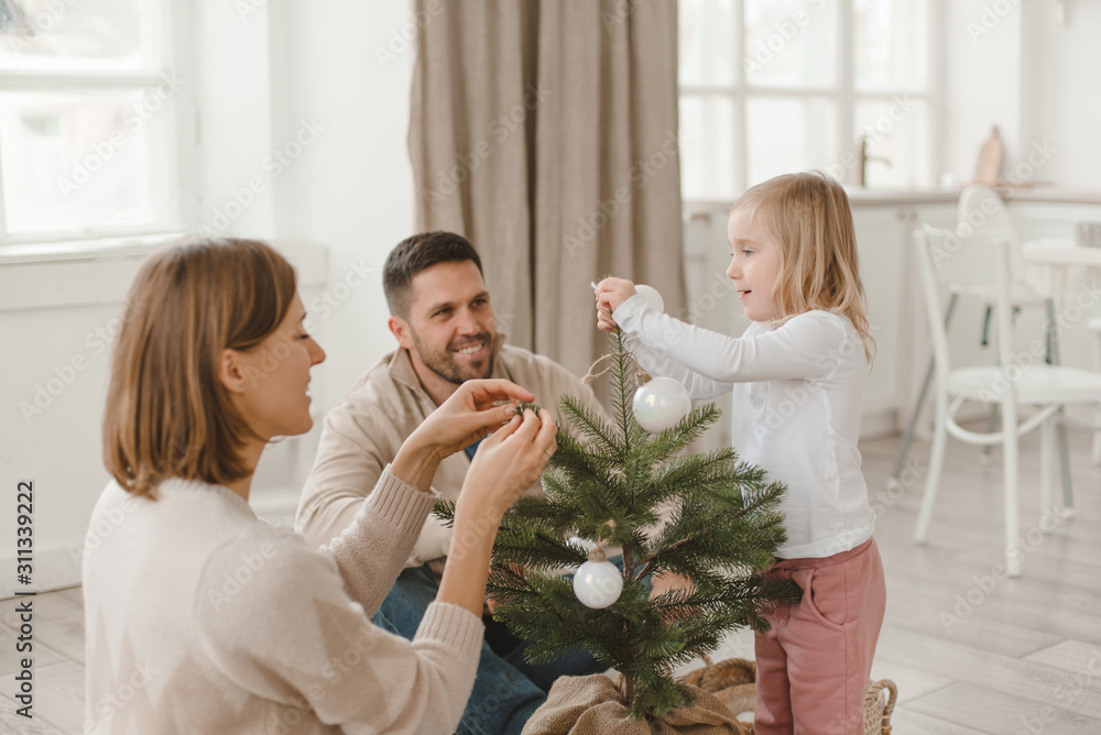 Cute baby girl with her parents play in a spacious bright minimalistic kitchen.