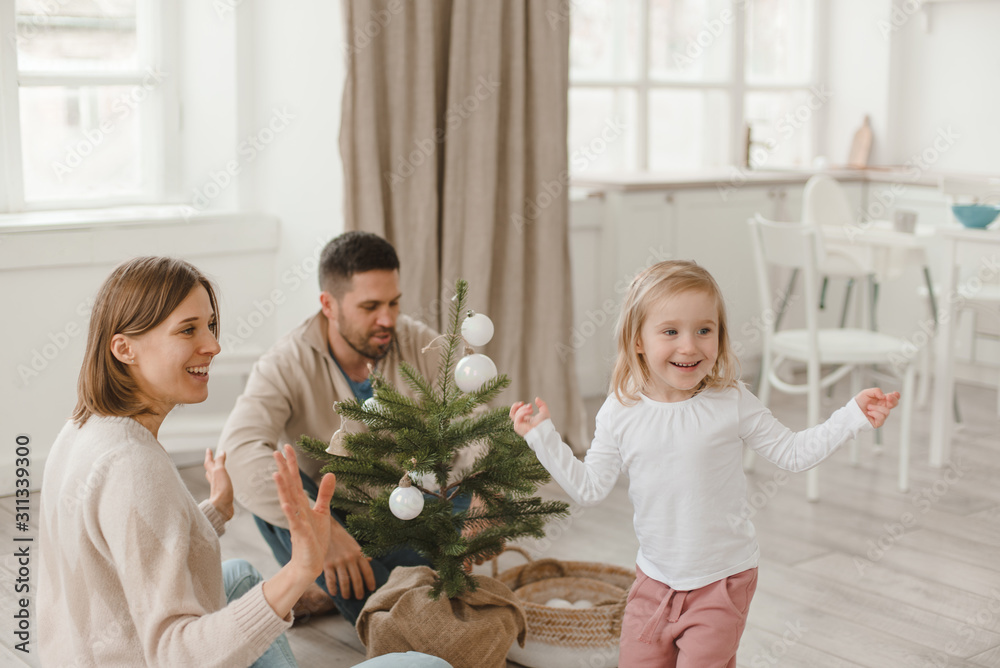 Cute baby girl with her parents play in a spacious bright minimalistic kitchen.