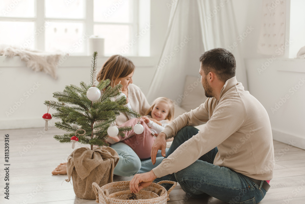 Cute baby girl with her parents play in a spacious bright minimalistic children's room.