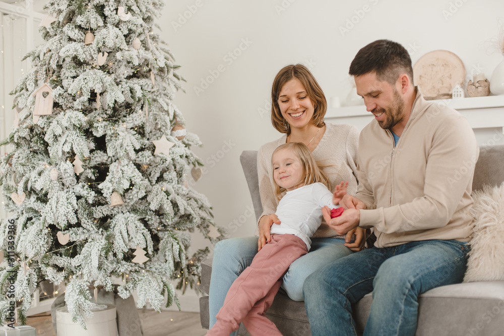 Family Christmas morning in a bright minimalistic living room near the Christmas tree.