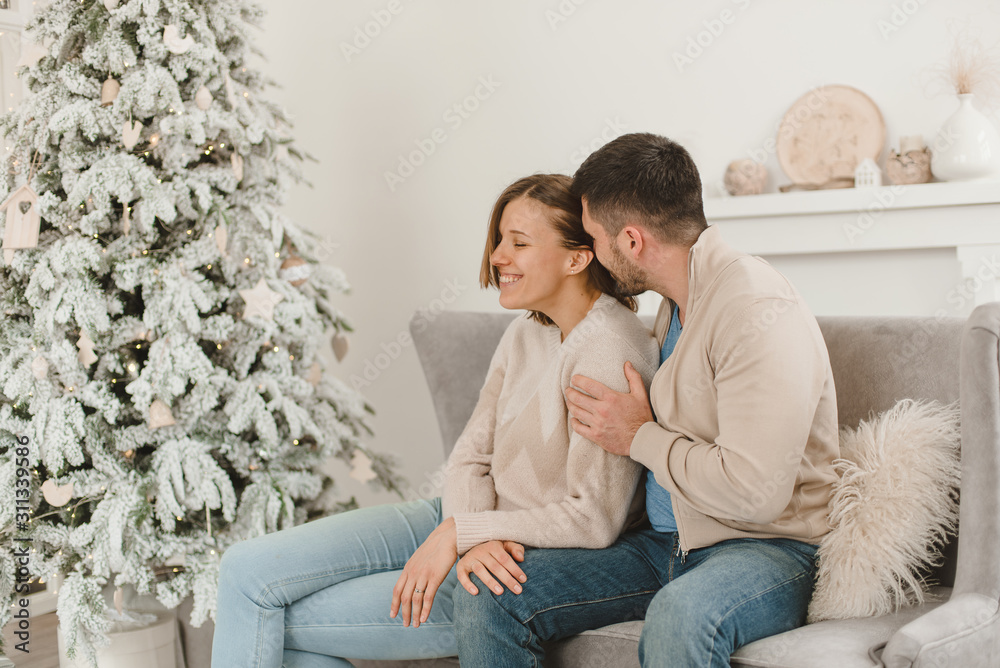 Young beautiful happy couple, sitting on the couch near the Christmas tree.