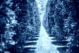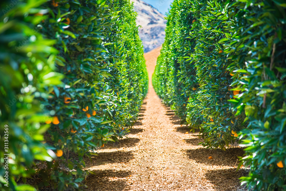Green California USA Orange orchard - Oranges on orange trees (Citrus Chinensis) - growing in organic fruit farm in hot sunny Californian weather with drip irrigation system of watering