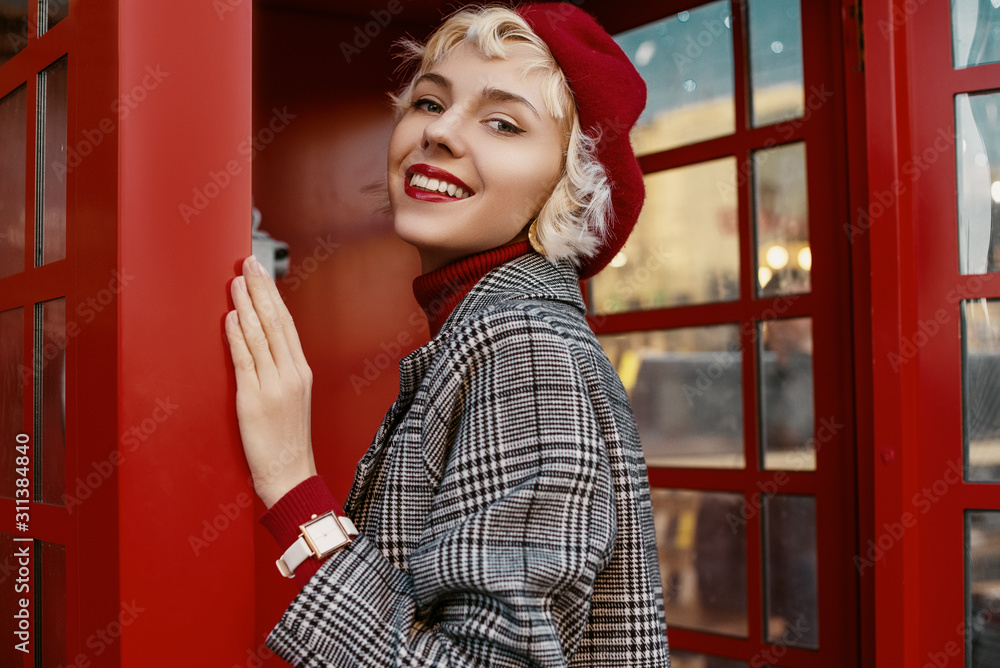 Fashionable happy smiling blonde woman wearing red beret, checkered coat, white wrist watch, posing in retro street phone booth. Copy, empty space for text