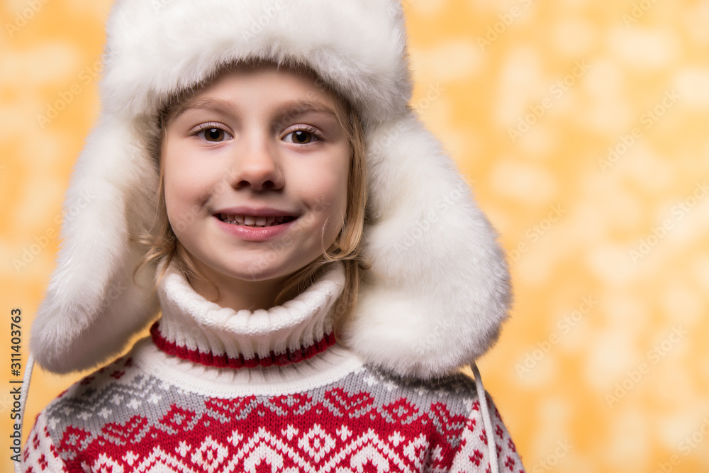 Little girl in winter look. Christmas concept.