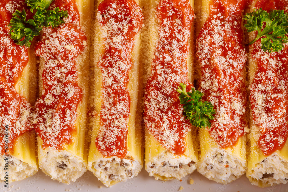 Cannelloni pasta staffed with ricotta, parmesan and mushrooms. Close up.