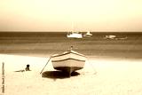 Cabo Verde Islands Sunny tropical Sal island vacation background of African child silhouette enjoying sandy Santa Maria beach with colourful boats and turquoise water seascape