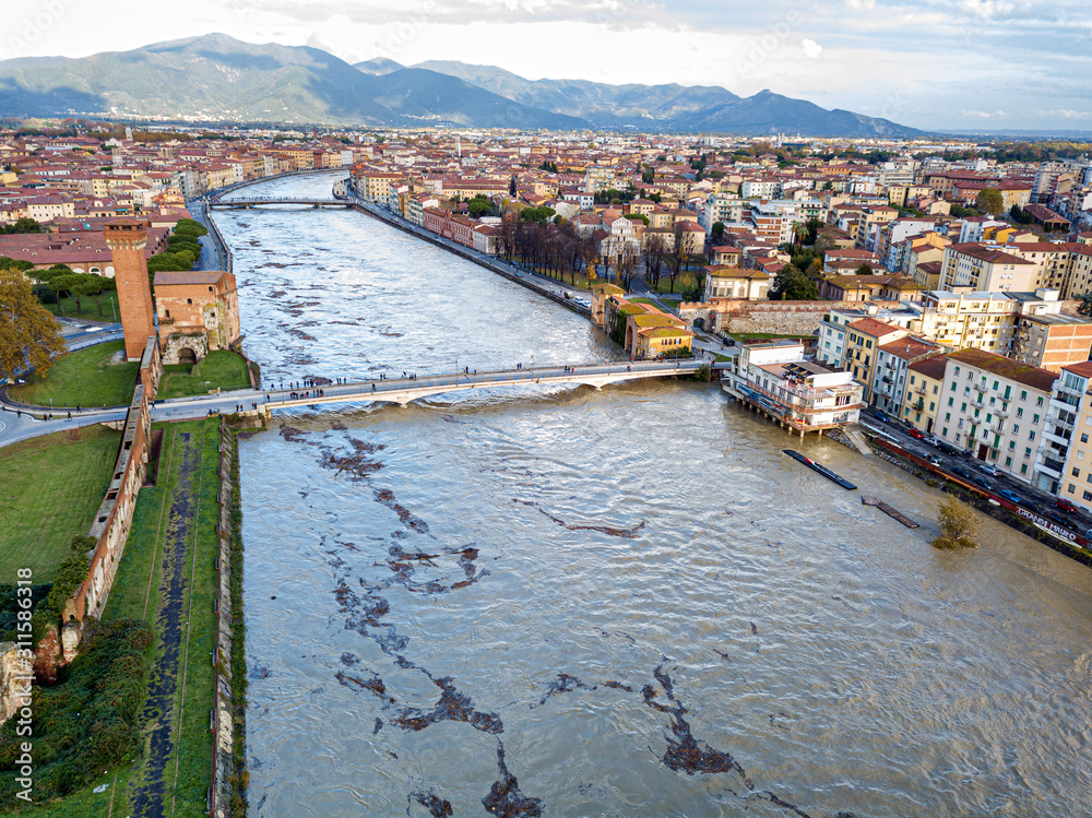 Aerial view of Pisa and the Arno river during a flood, Tuscany, Italy