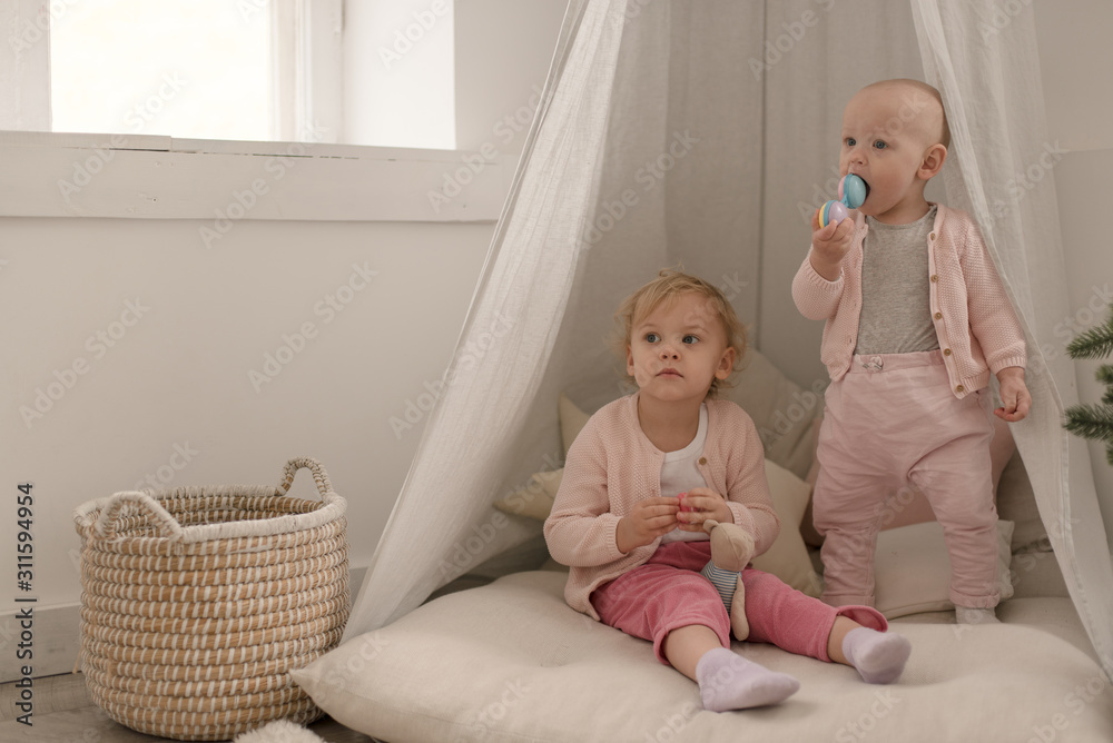 Two cute little baby girls play in a spacious bright minimalistic children's room.