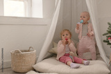 Two cute little baby girls play in a spacious bright minimalistic children's room.