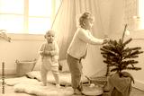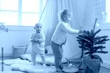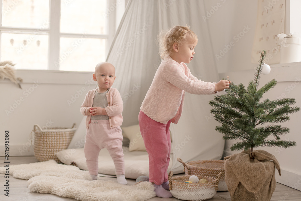 Two cute little baby girls play in a spacious bright minimalistic children's room.