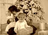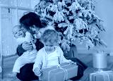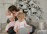 Family Christmas morning in a bright minimalistic living room near the Christmas tree.