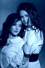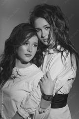 Studio portrait of two red-haired twin girls.