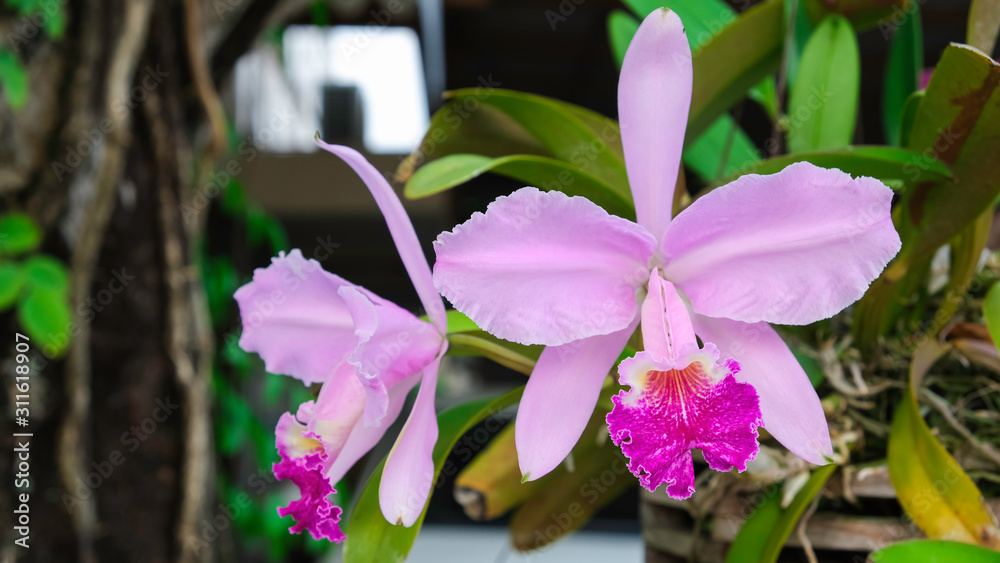 two fresh cattleya flower. Pink and violet orchid tree hanging in garden.