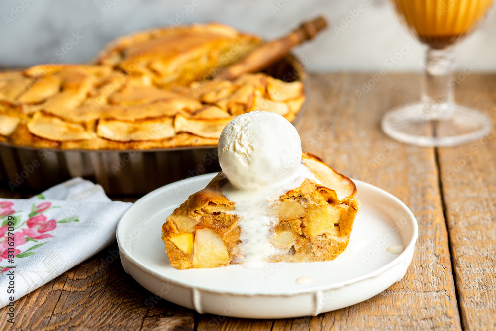 Charlotte pie on a wooden table with coffee. Ice cream pie. Slice of apple pie with a scoop of ice cream and caramel sauce on a plate, baking concept in the fall. A beautiful piece of fruit pie