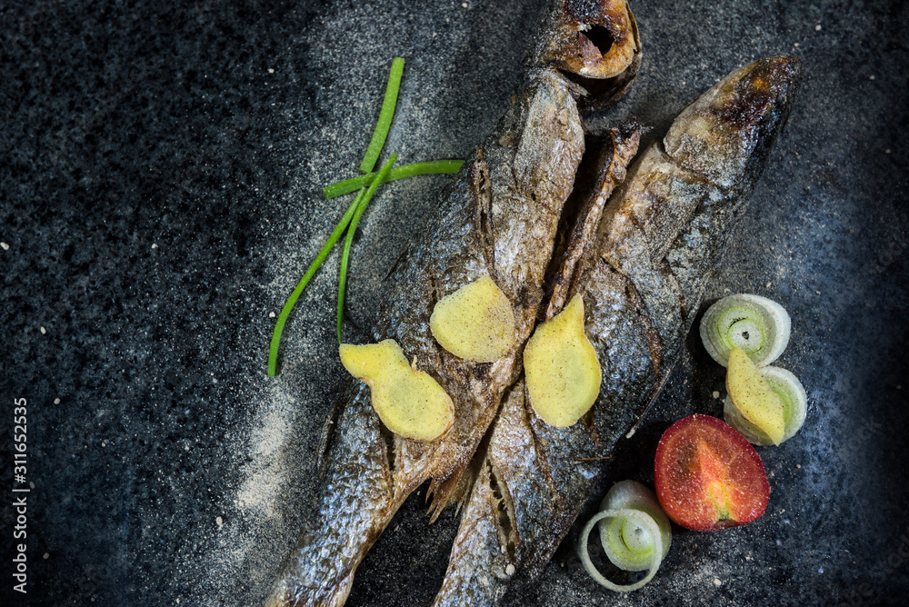 Grilled fish and garnishes on a black marble background