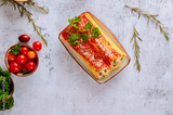 Cannelloni jumbo pasta on plate with tomato.
