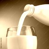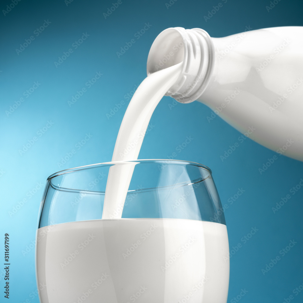 Nalewanie mleka do szklanki z butelki na niebieskim tle