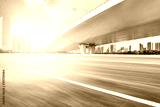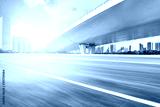 Under the overpass, there are no cars and no people on the asphalt road, with the modern urban architecture skyline as the background.
