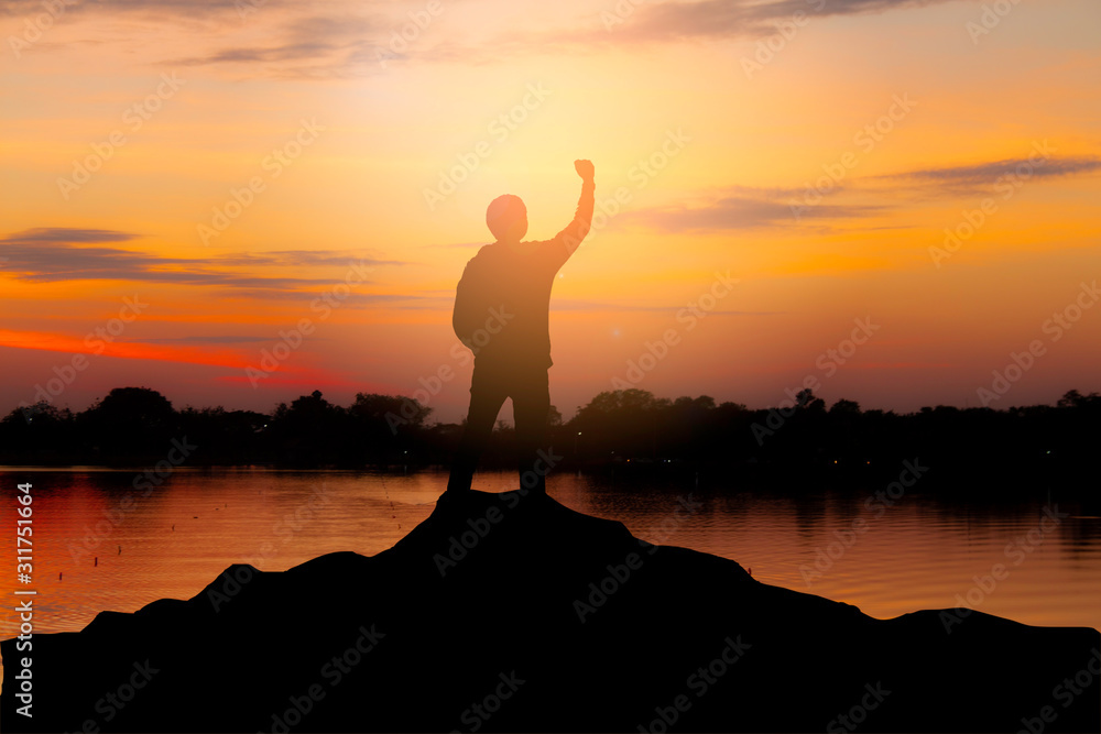 Silhouette of a happy man raised hands up as a successful, victory and achieve a business goal in the sunset sky background.